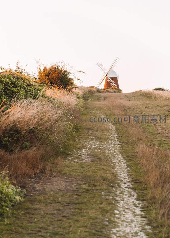 一条碎石小径蜿蜒向上,尽头是矗立在山坡上的古老风车,四周草木葱茏,夕阳余晖温柔洒落。