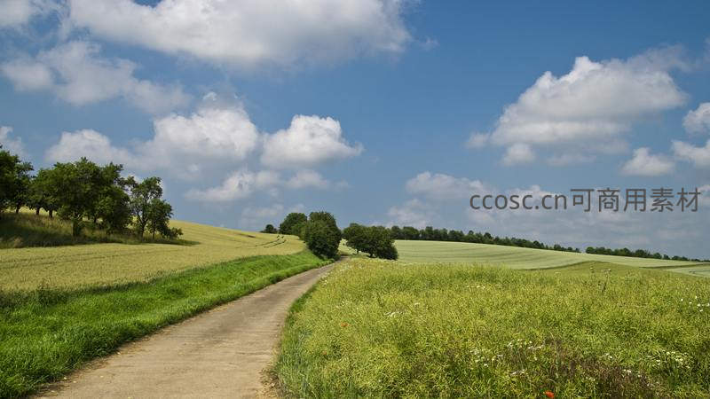 一条泥土小径蜿蜒穿过起伏的绿色田野与金黄麦浪,远处树木成行,天空湛蓝白云朵朵,营造出宁静悠然的田园诗意画面。