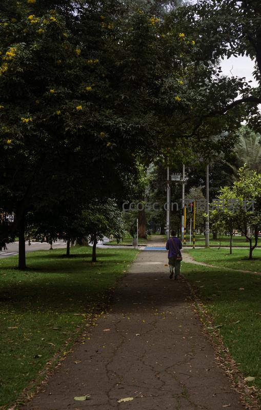 一位行人背对镜头,走在公园里被茂密树木环绕的林荫小径上,地上散落着几片落叶,四周绿意盎然,氛围宁静而悠闲。