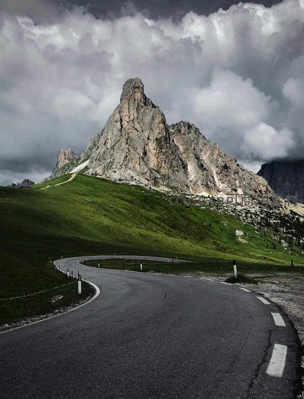 一条弯曲的柏油路在翠绿的山坡上延伸,直指高耸入云的岩石山峰。厚重的云层低垂,为壮丽山景增添神秘氛围,是探索自然之美的绝佳路径。