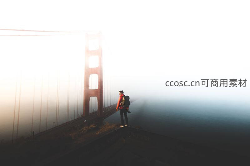 一位背包客伫立桥畔,凝望被浓雾半掩的金门大桥塔身,红衣身影在朦胧光晕中显得格外孤独而坚定。