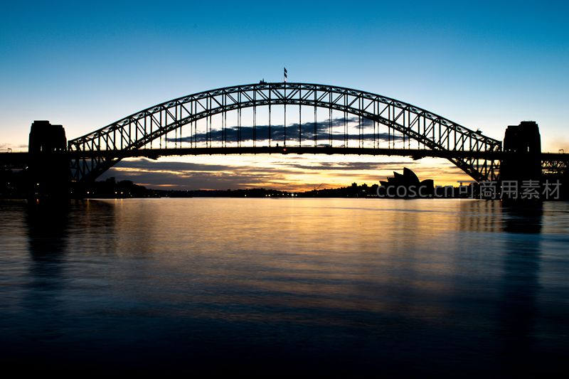 夕阳西下,悉尼海港大桥化为雄伟剪影,倒映在平静水面,远处歌剧院轮廓隐约可见,天空由金黄渐变为深蓝,诗意盎然。