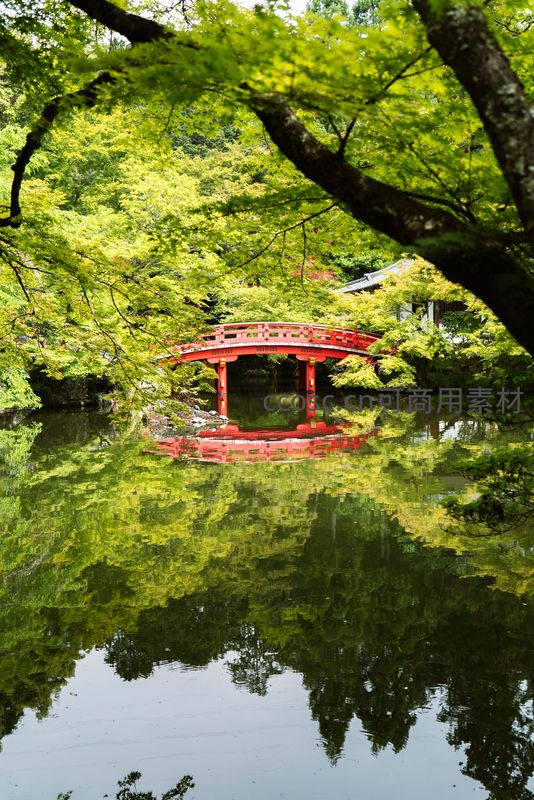 绿意盎然的红桥倒影如画