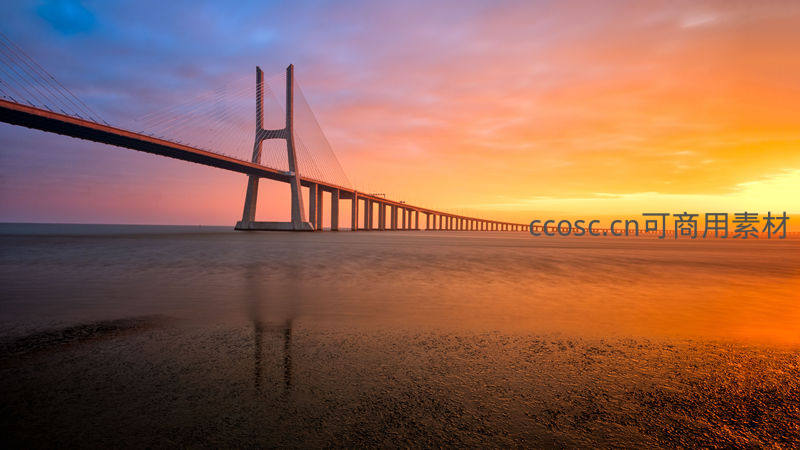一座超长的斜拉桥在辉煌的金色晚霞中向远方延伸,其雄伟的倒影清晰地印在平静的滩涂上,天地一色,营造出无垠、静谧且震撼人心的视觉体验。