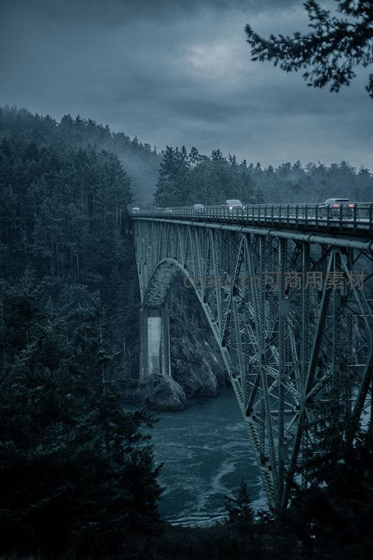 阴沉天空下,钢铁结构的大桥横跨湍急河流,四周密林环绕,车辆穿行其上,展现现代工程与原始自然碰撞出的冷峻美感。