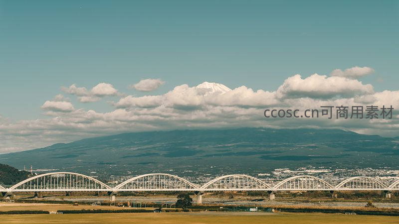 巍峨的富士山顶白雪皑皑,在蓝天白云下清晰可见,前景是数座洁白的拱形铁路桥横跨于广袤田野之上,构成一幅宁静而经典的日式田园画卷。