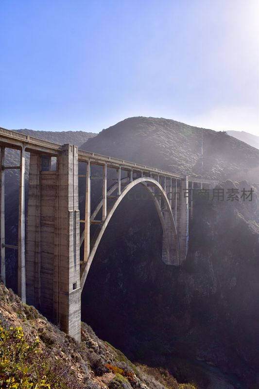 雄伟的混凝土拱桥高耸于深邃峡谷之上,阳光洒在桥体和山峦间,展现出人类工程与壮丽自然景观的完美结合。