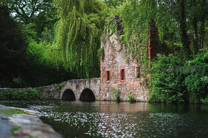 绿荫古桥遗迹,藤蔓缠绕静谧水乡