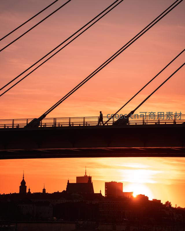 在绚烂的橙红色夕阳中,一名行人的剪影独自走过斜拉桥面,远处城市轮廓静默伫立,营造出温暖而孤寂的黄昏氛围。