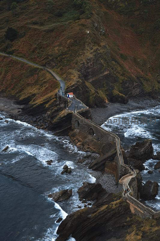 从高空俯瞰,一条蜿蜒的石桥沿着陡峭的岩壁延伸至海边,桥下是翻滚的白色浪花。桥头小屋色彩鲜明,与苍翠山坡和深蓝海水形成强烈对比。