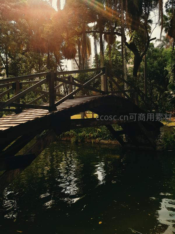 林间木桥斜阳照,光影斑驳水波摇