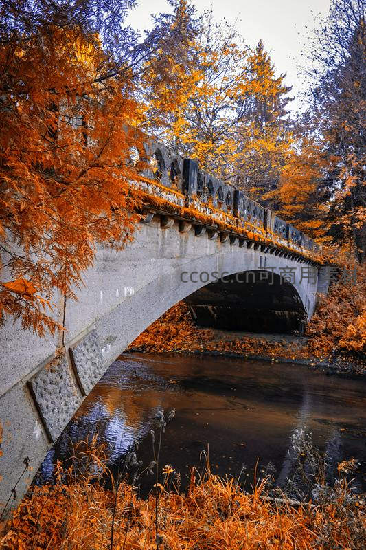 一座古典石拱桥静静伫立在秋色里,周围树木披上浓烈橙红色调,落叶铺满河岸,倒影在平静水面,构成一幅诗意秋景图。