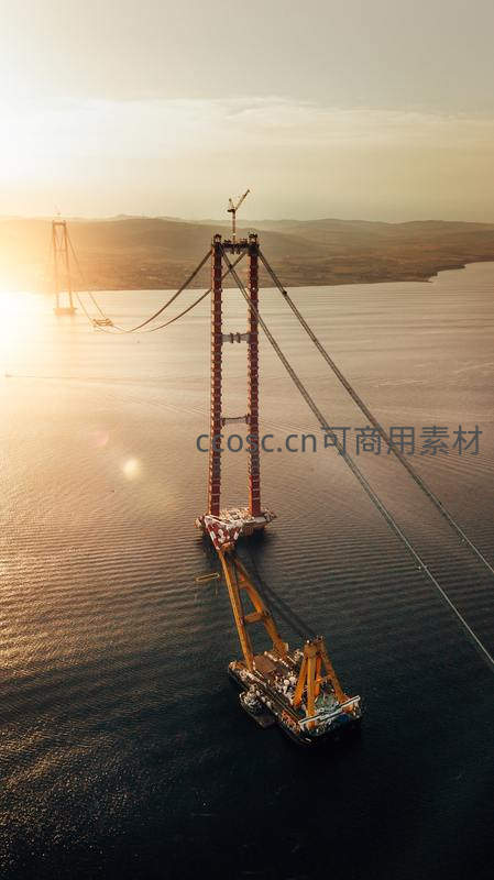 金色夕阳映照海面,大型浮吊船正进行桥梁主塔安装作业,展现现代工程力量与自然光影交织的震撼瞬间。