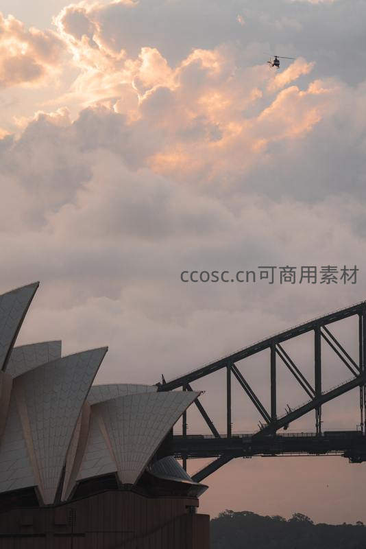 黄昏时分,悉尼歌剧院的白色帆顶与海港大桥的钢铁骨架在霞光中形成经典剪影,一架直升机掠过绚烂云层,构成一幅壮丽的城市天际线画卷。