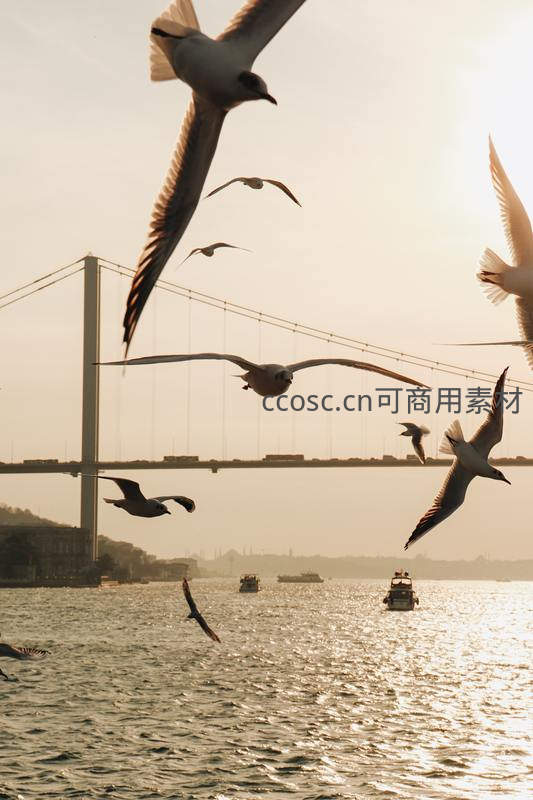 伊斯坦布尔海峡海鸥飞舞日落时分