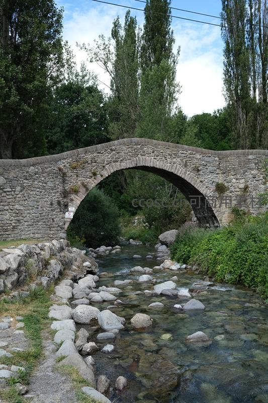 一座古老的石砌拱桥优雅地跨越在清澈见底的小溪上,两岸绿树成荫,溪水潺潺,充满宁静祥和的田园诗意。