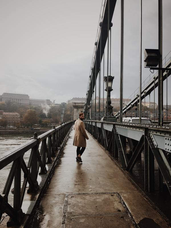 一位行人在湿漉漉的复古铁桥上缓步前行,背景是朦胧的城市天际线,营造出宁静而略带忧郁的都市生活氛围。