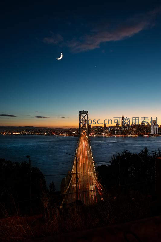 新月高悬于深蓝夜空,下方是灯火通明的城市天际线和一座横跨水面的大桥,车灯轨迹如星河般流动。