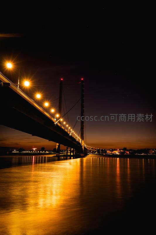 深蓝夜空下,斜拉桥的暖黄色灯光沿着桥身蜿蜒,倒映在如镜的水面上,形成流动的光带,远处城市灯火阑珊,营造出宁静又充满科技感的都市夜景。