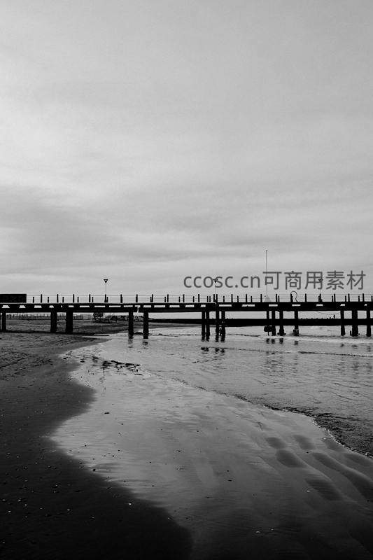 灰调天空下,一座木质长桥横跨湿润沙滩与浅水区,桥上行人稀疏,水面倒映着结构轮廓,营造出宁静而略带忧郁的海滨氛围。