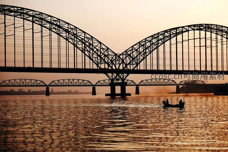 暮色中,钢铁双拱桥化作深色剪影横跨江面,几艘小船悠然划过波光粼粼的水面,营造出诗意宁静的黄昏氛围。