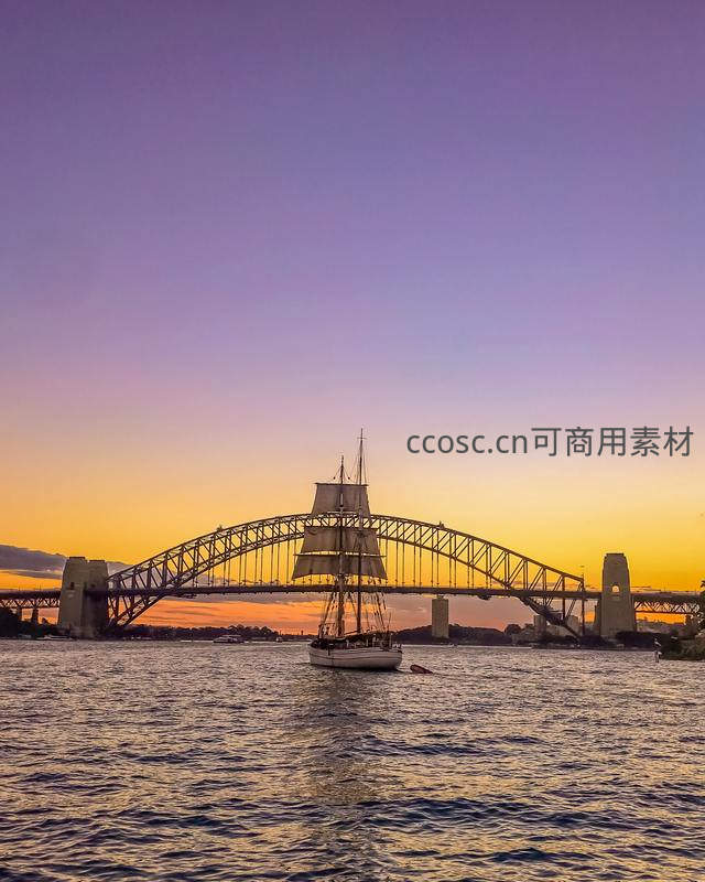 夕阳将天空染成紫橙渐变色,一艘古典帆船静静航行于悉尼海港之上,宏伟的海港大桥在背景中形成壮丽剪影,尽显城市浪漫与历史韵味。