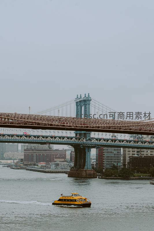 曼哈顿桥下黄色渡轮穿行河面