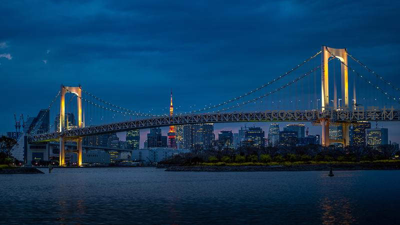 东京湾上彩虹大桥在夜幕下灯火辉煌,桥身与远处东京塔、高楼群交相辉映,水面倒影如画,展现都市浪漫与现代感。