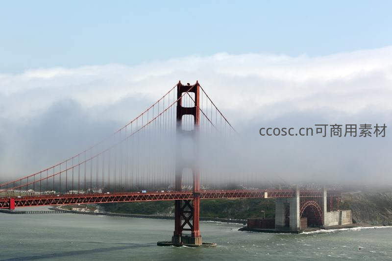 标志性的红色金门大桥在浓雾中若隐若现,桥塔穿云而出,水面波光粼粼,云海翻腾,展现了旧金山这座城市的神秘与壮丽。