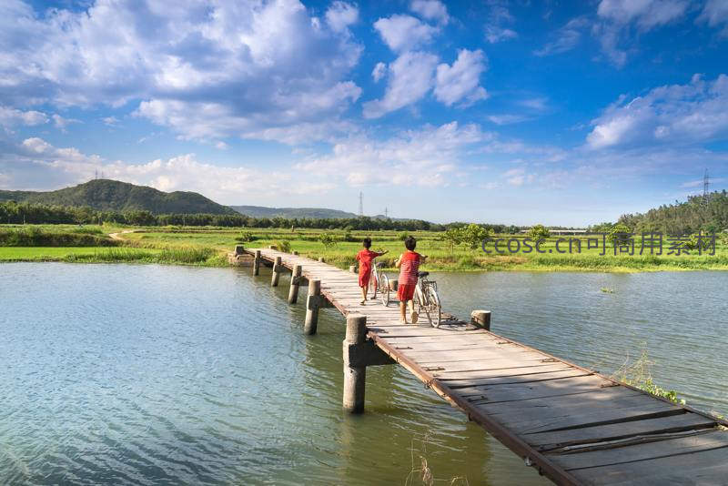 两个孩子在宁静的乡间木桥上推着自行车,背景是广阔的绿色田野和连绵青山,蓝天白云映衬下充满自然与童趣。