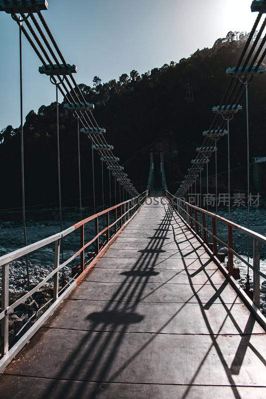 阳光穿过悬索桥钢缆,在桥面投下整齐而深邃的阴影,两岸青山环抱,溪流潺潺,营造出宁静而富有几何美感的山野通行场景。