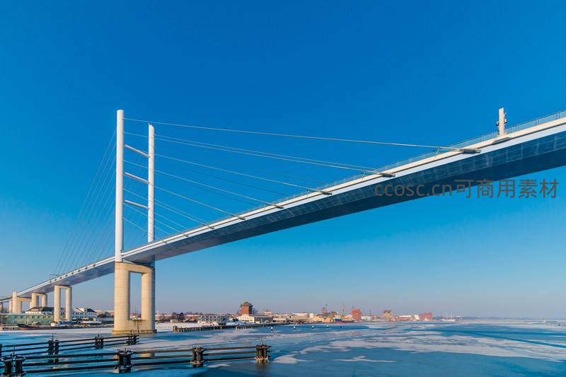 冬日晴空下横跨冰河的大桥