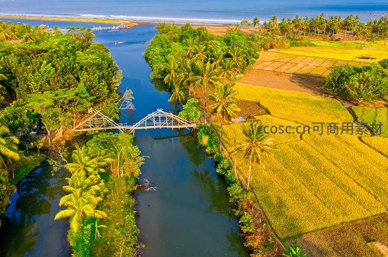 热带田园风光:金色稻田、椰林与小河上的木桥