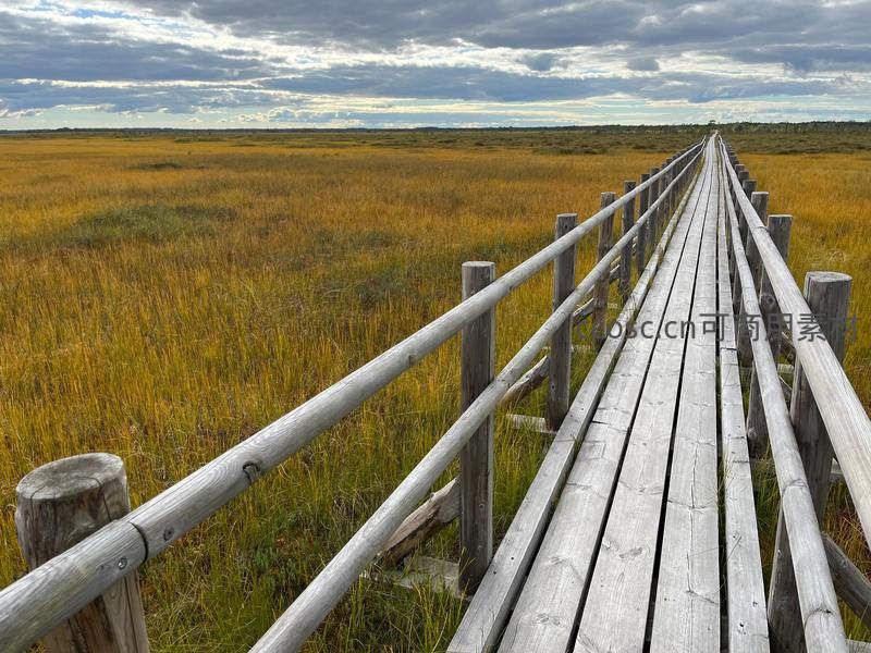 一条蜿蜒的木质栈道穿过广袤的金色草甸,在多云天空下向远方延伸,营造出静谧而深远的自然意境,是亲近自然、放松身心的理想之地。