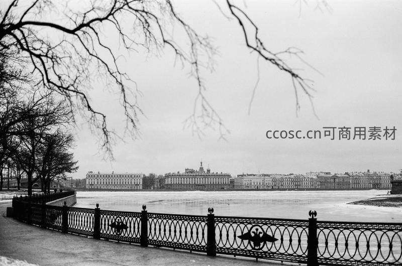 黑白影像中,光秃的树枝在前景形成天然画框,远处宏伟的古典建筑群沿河而立,冰封的河面与精致的铁艺围栏共同营造出静谧而富有历史感的冬日城市景观。