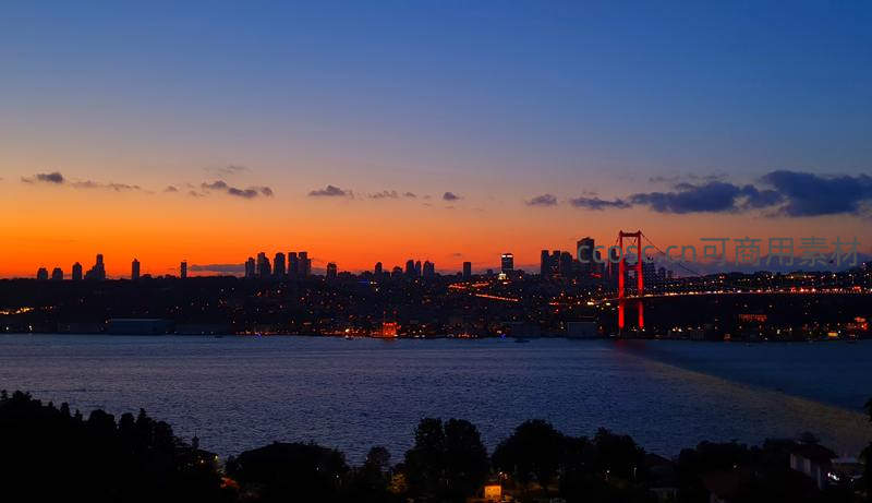 夕阳将天空染成绚烂的橙红,伊斯坦布尔的城市天际线化为深邃剪影。横跨海峡的红色大桥灯火初上,与水面上的点点船灯共同勾勒出这座横跨欧亚大陆城市的浪漫与繁华。