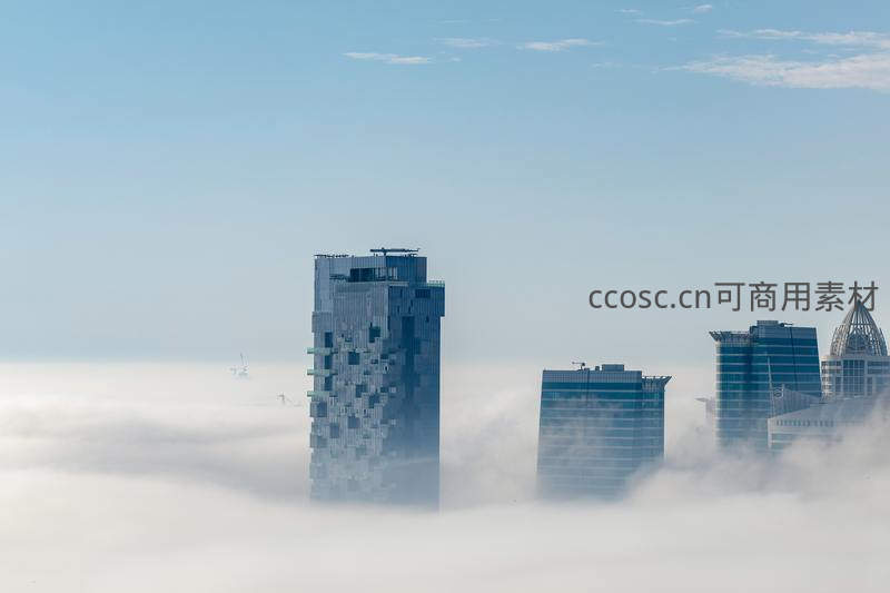 从高空俯瞰,几座现代化摩天大楼如孤岛般矗立在翻滚的云海之上,玻璃幕墙反射着柔和天光,营造出超现实的梦幻都市景观。