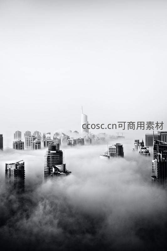 以黑白影像呈现的城市鸟瞰图,浓雾弥漫于楼宇之间,仅露出建筑顶部轮廓,营造出一种神秘、空灵且充满未来感的艺术氛围。