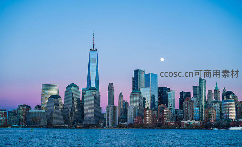 暮色渐浓,城市天际线在粉紫色晚霞中勾勒出清晰轮廓,一轮明月悄然升起,水面波光粼粼,为都市夜景增添一份诗意与静谧。