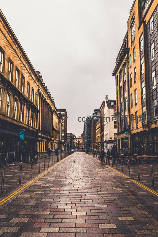 一条被雨水浸润的石板路向远方延伸,两侧是古典风格的欧洲建筑,天空阴沉,行人稀少,营造出宁静而略带忧郁的城市氛围。