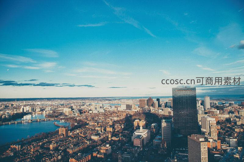 从高空俯瞰波士顿全貌,蜿蜒的河流穿城而过,密集的建筑群铺展至远方,清澈的蓝天与城市景观共同构成一幅壮丽的都市画卷。