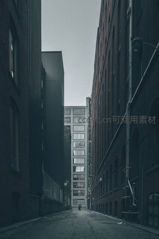 一条狭窄的工业风巷道,两侧是高耸的砖墙建筑,尽头一个渺小的人影独自前行,灰暗天空下营造出强烈的孤独感与空间压迫感。