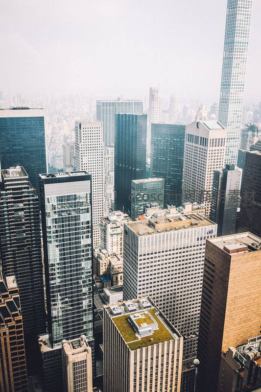 薄雾笼罩下的城市天际线,玻璃幕墙高楼错落有致,其中一栋顶楼设有绿色屋顶,为钢筋水泥增添一抹生机。