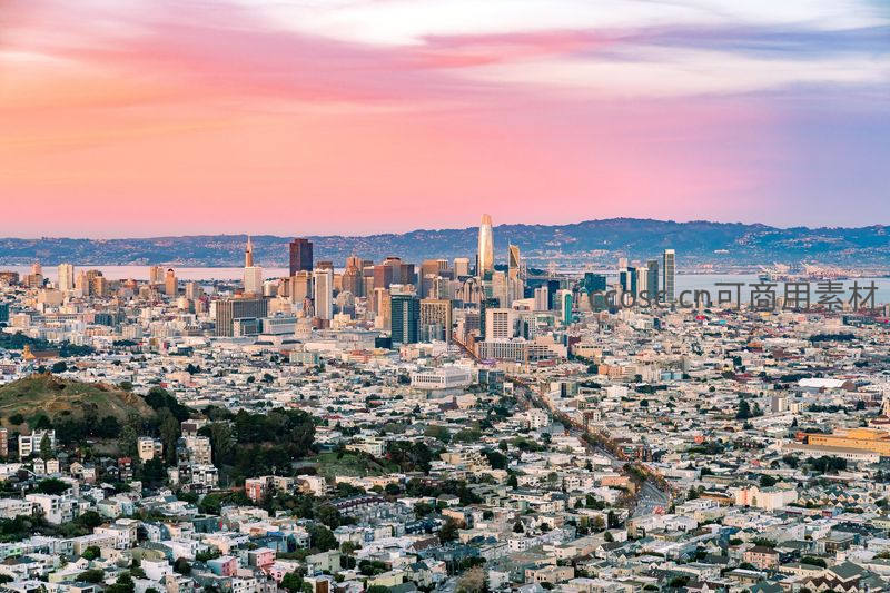 夕阳将天空染成梦幻的粉红色,旧金山的城市全景尽收眼底。从山坡上的住宅区到市中心的摩天大楼,再到远方的海湾,整个城市沐浴在温暖柔和的光辉之中。