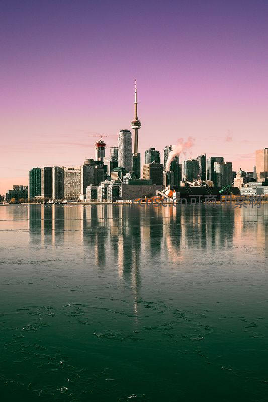 多伦多塔倒影湖面,粉紫天空如梦似幻