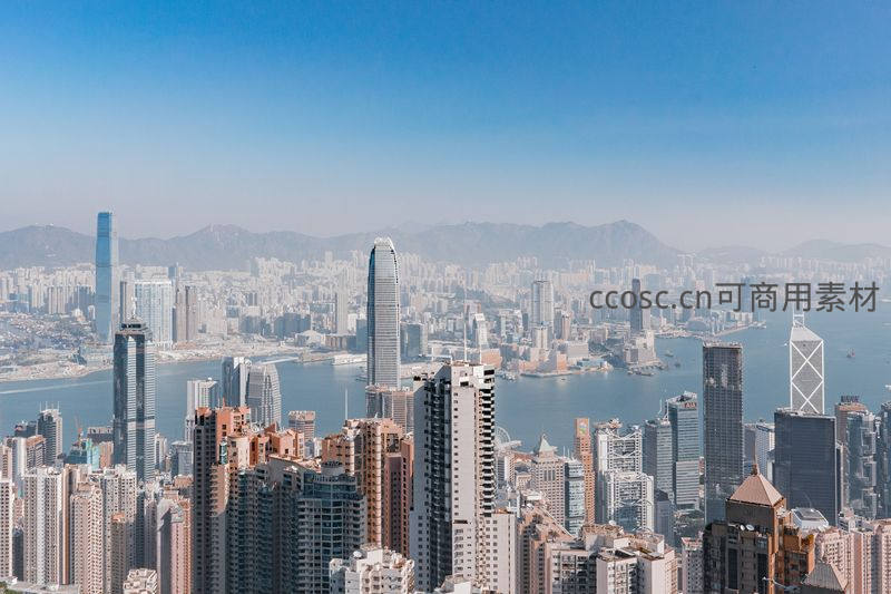 香港维多利亚港两岸林立着世界级摩天大楼,在清澈蓝天的映衬下,展现出东方之珠的繁华与现代感,海面波光粼粼,景色壮阔。