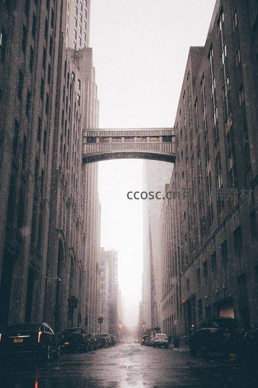 细雨和薄雾笼罩着城市,一座空中连廊横跨在两栋庄严的古典建筑之间,街道上车辆稀疏,整个画面充满宁静而略带忧郁的诗意。