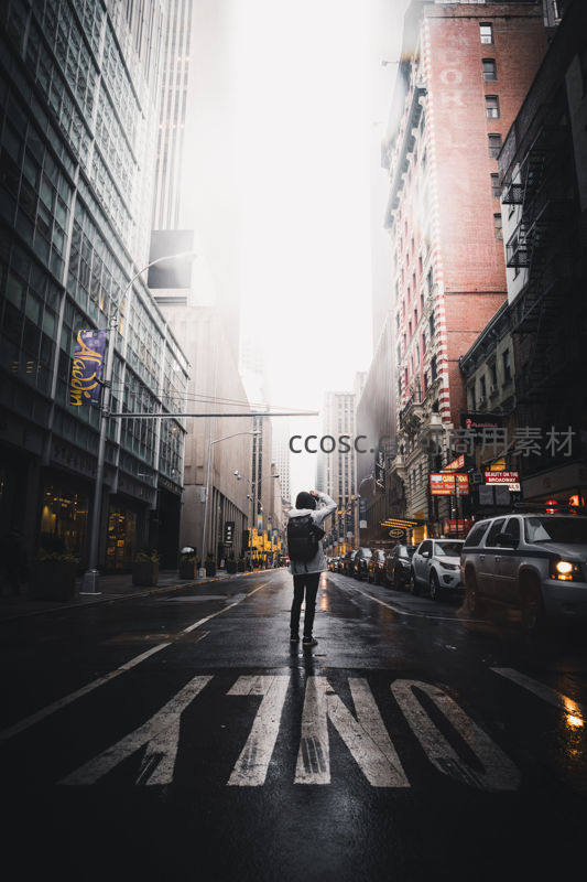 湿漉漉的街道上,一个背着背包的人伫立在斑马线中央,两侧高楼林立,远处光线穿透薄雾,营造出静谧而略带忧郁的都市氛围。
