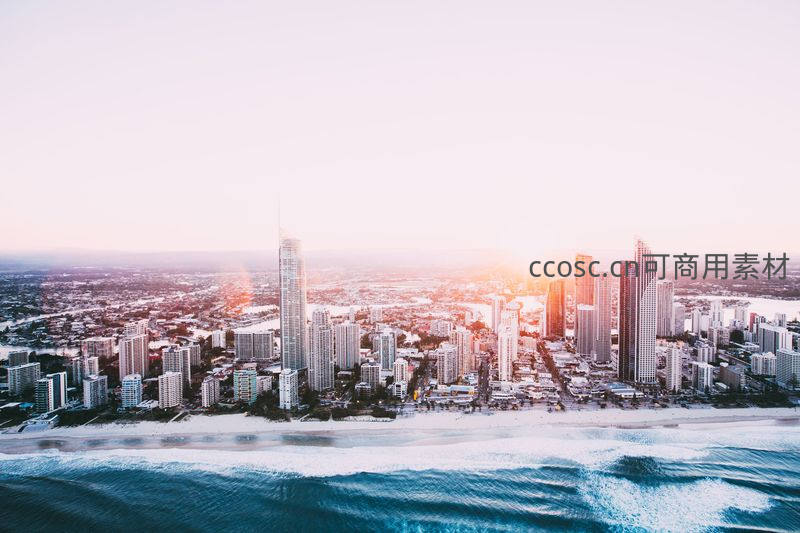 夕阳西下,金色光芒洒满海岸线,现代化高楼群矗立在沙滩后方,海浪轻拍岸边,构成一幅宁静而壮美的海滨都市画卷。