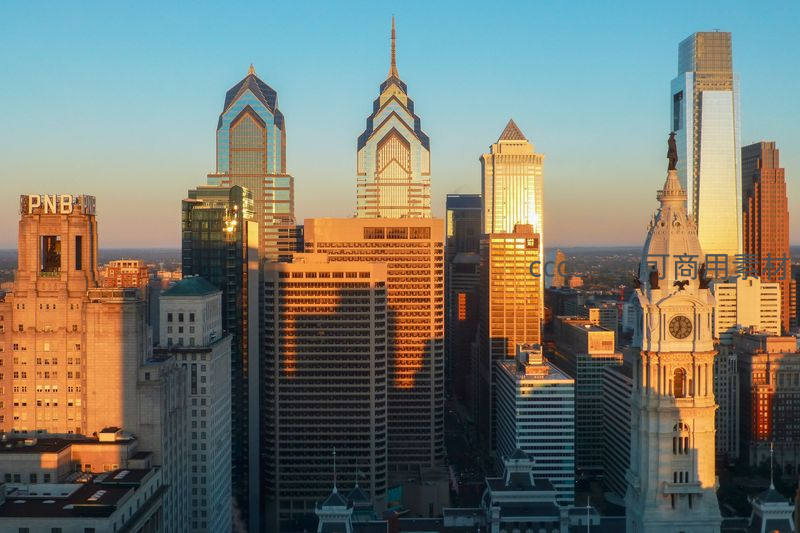落日余晖为费城的现代高楼与历史钟楼披上金色外衣,新旧建筑交相辉映,勾勒出城市独特的黄昏轮廓。